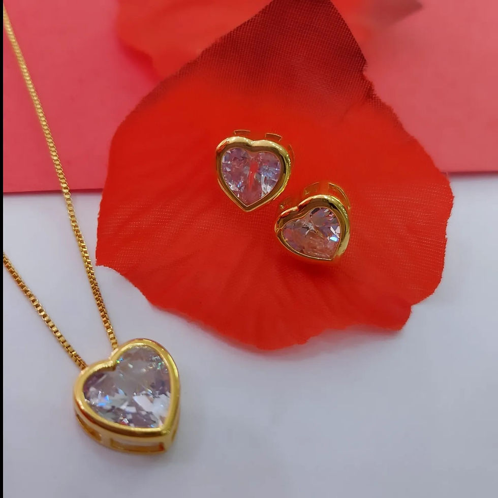 Conjunto Coração Verde Cravejado em Ródio Branco